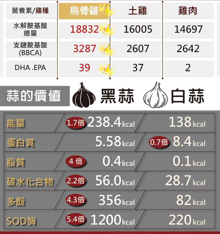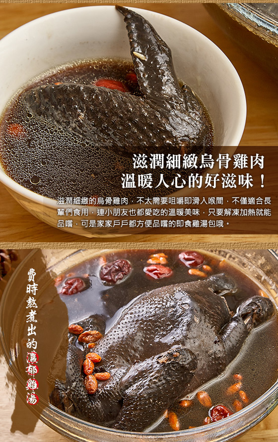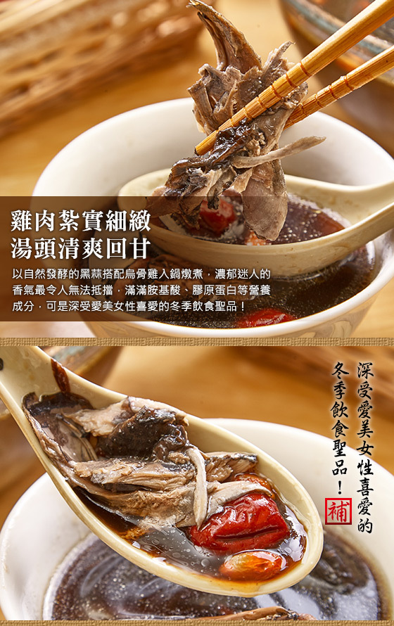 成分:雞高湯(雞肉、水)、烏骨雞肉、米酒、黑蒜頭、鹽、冰糖、枸杞、熟地、紅棗、薑